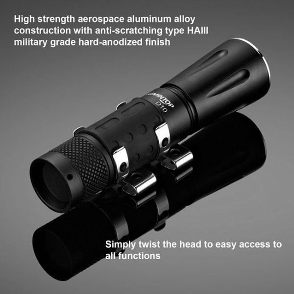 D10 is at just 3.7 inches long and weighing only 49g, the LUMINTOP D10 has amazing performances as a LED diving light, which the max diving depth is 150 meters, and it can mount on dive mask with special clip for hands-free. The neutral white light provides better beam distance under water with high color rendering. You will be marveLED at its excellent high reliability & durability and exquisite workmanship. All these and the following features make it become your best choice to add to a flashlight collection or to give as gift or to serve as your reliable companion.