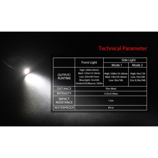 | OUTPUT/ RUNTIME | High: 350lm/30min | High: 350lm/1h 50min | High: 5lm/12h |
